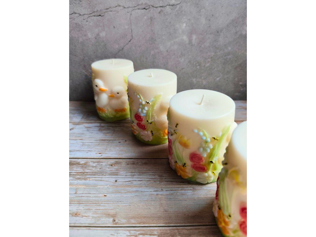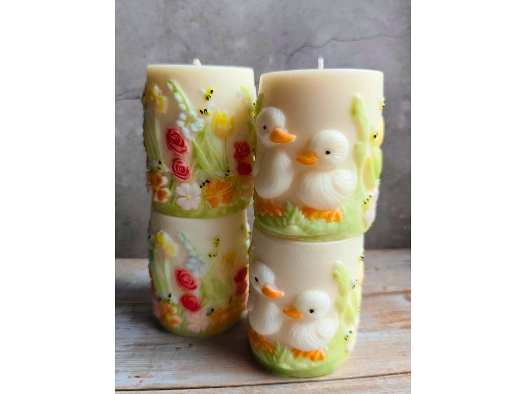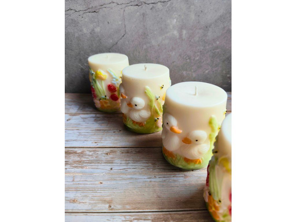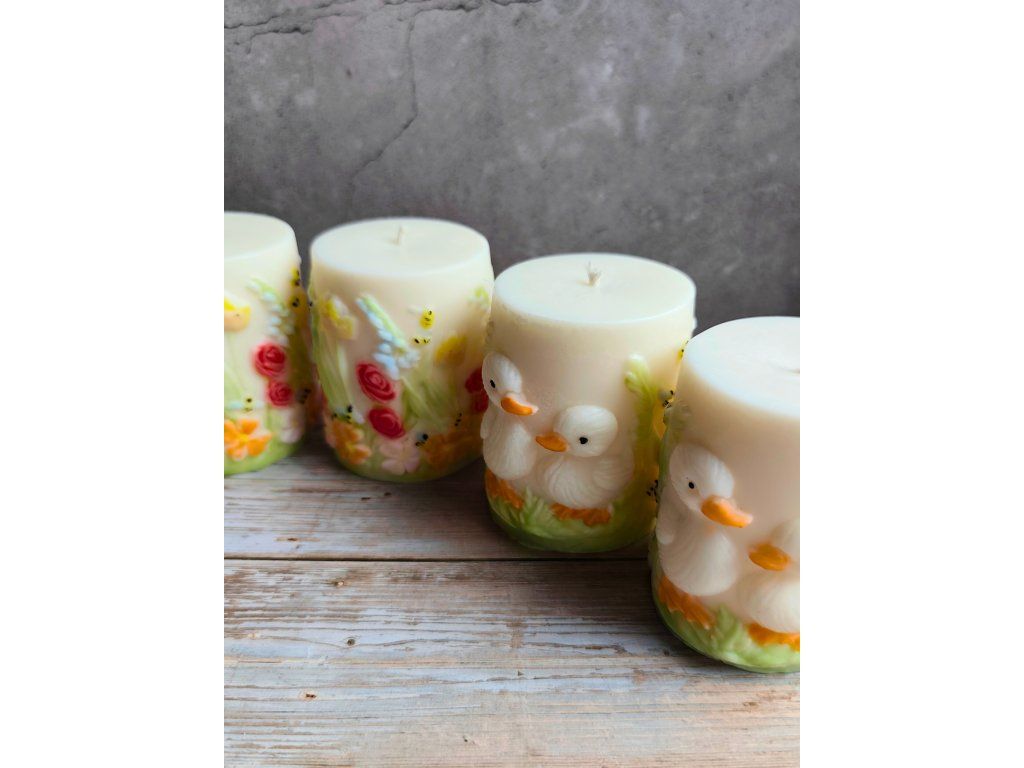Ručně vyráběná svíčka s něžným jarním motivem kachňátek a květin. Každý kus je originál – motiv je ručně malovaný a vytvářený vrstvu po vrstvě, proto se může lehce lišit.