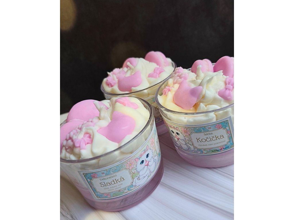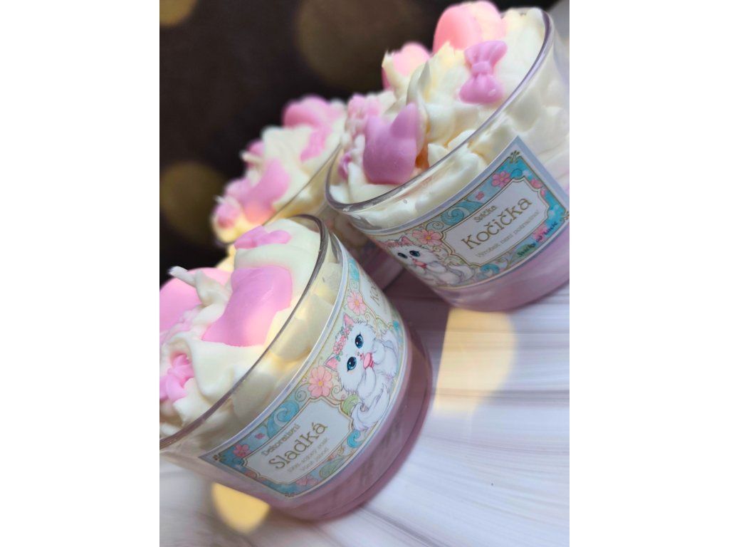 Tato svíčka je splněným snem pro všechny milovníky koček a sladkého designu. „Sladká kočička“ není jen obyčejná svíčka, je to umělecký objekt, který v sobě spojuje precizní ruční práci a hravou eleganci. Dominantou je bohatá vrstva „voskové šlehačky“, kterou zdobí drobné tlapky, mašličky a hlava kočičky.