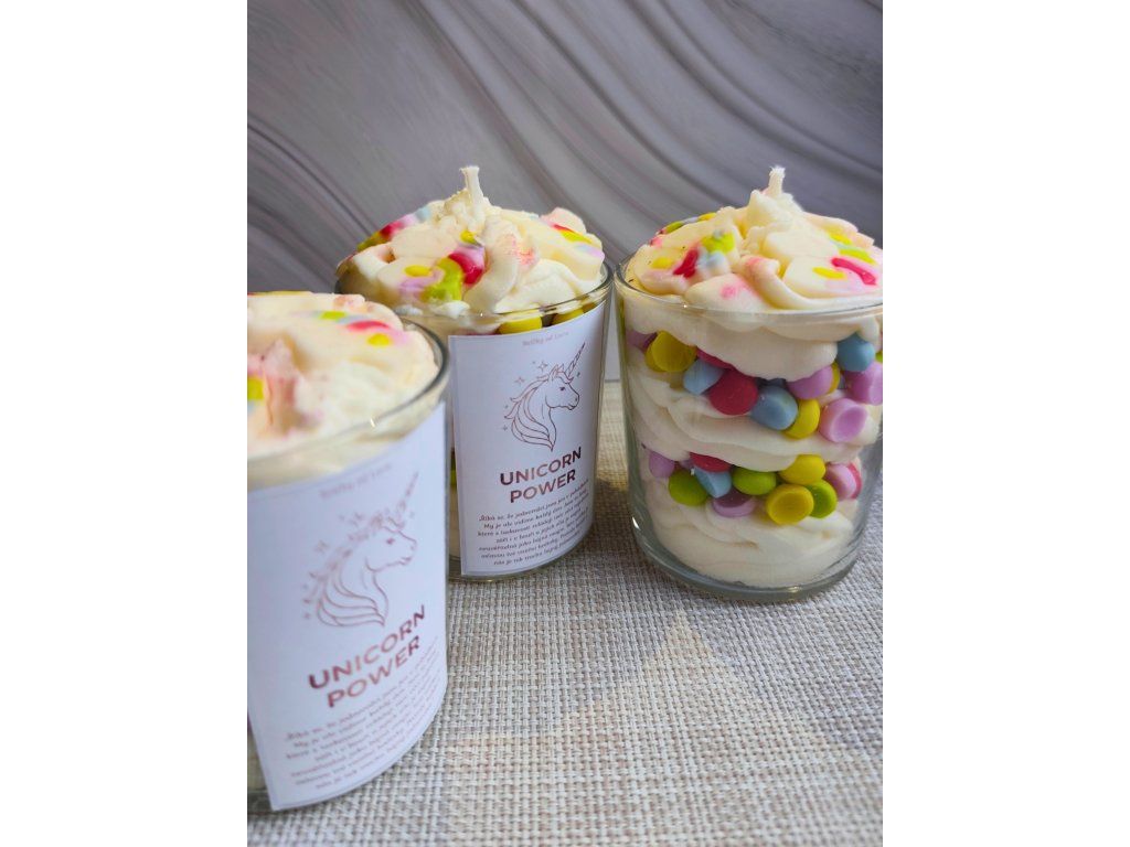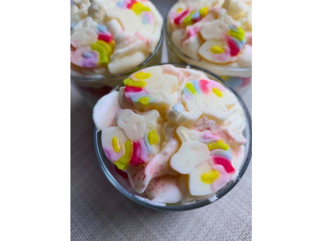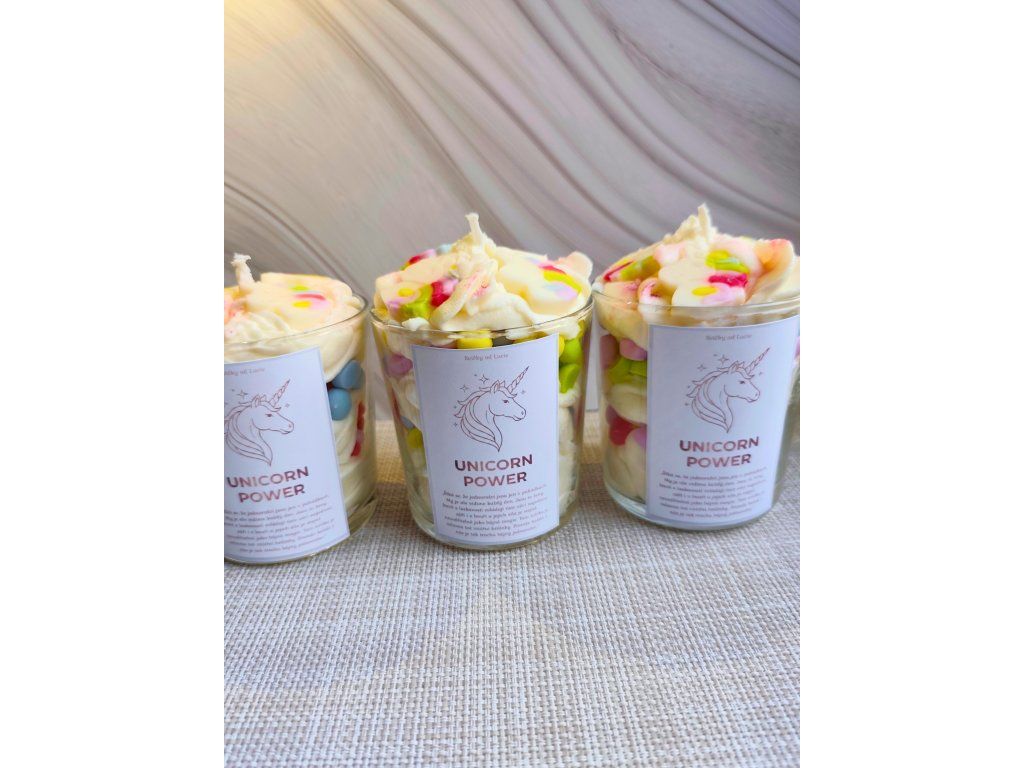 Vizuální zážitek: Svíčka je tvořena bohatou vrstvou nadýchané voskové „šlehačky“, v níž jsou ukryty barevné kuličky a drobní jednorožci. Každý pohled na ni vám zvedne náladu.